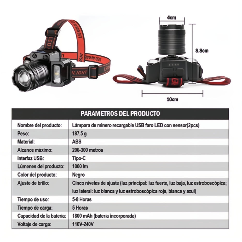 Linterna Led Minera Casco 5 Modos Sensor Recargable Usb